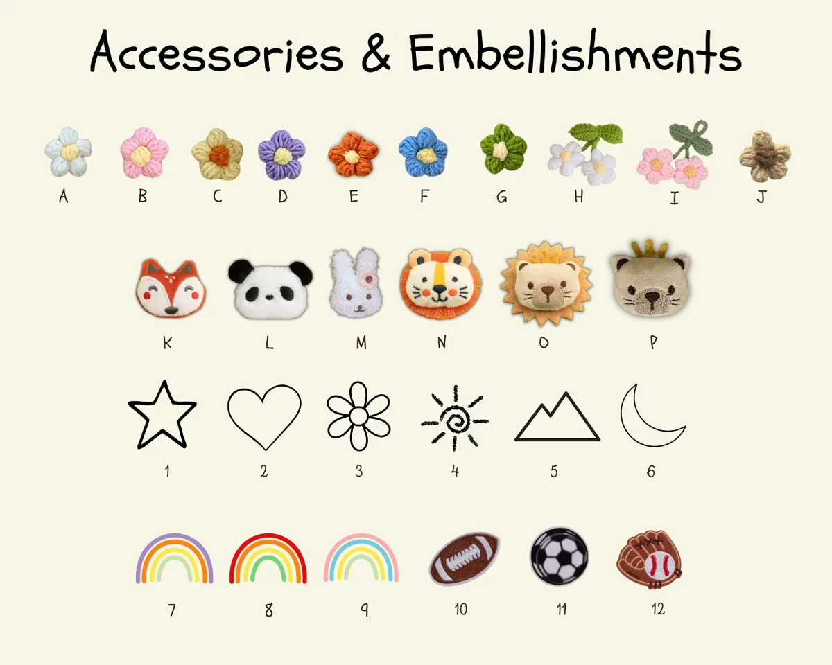Stiched Yarn Icon (e.g. Rainbow, Star, Heart) & Animal Embellishments (e.g. Fox, Panda, Bunny, Lion) will be placed after the name. If there is not enough space, I will put it right underneath the name.