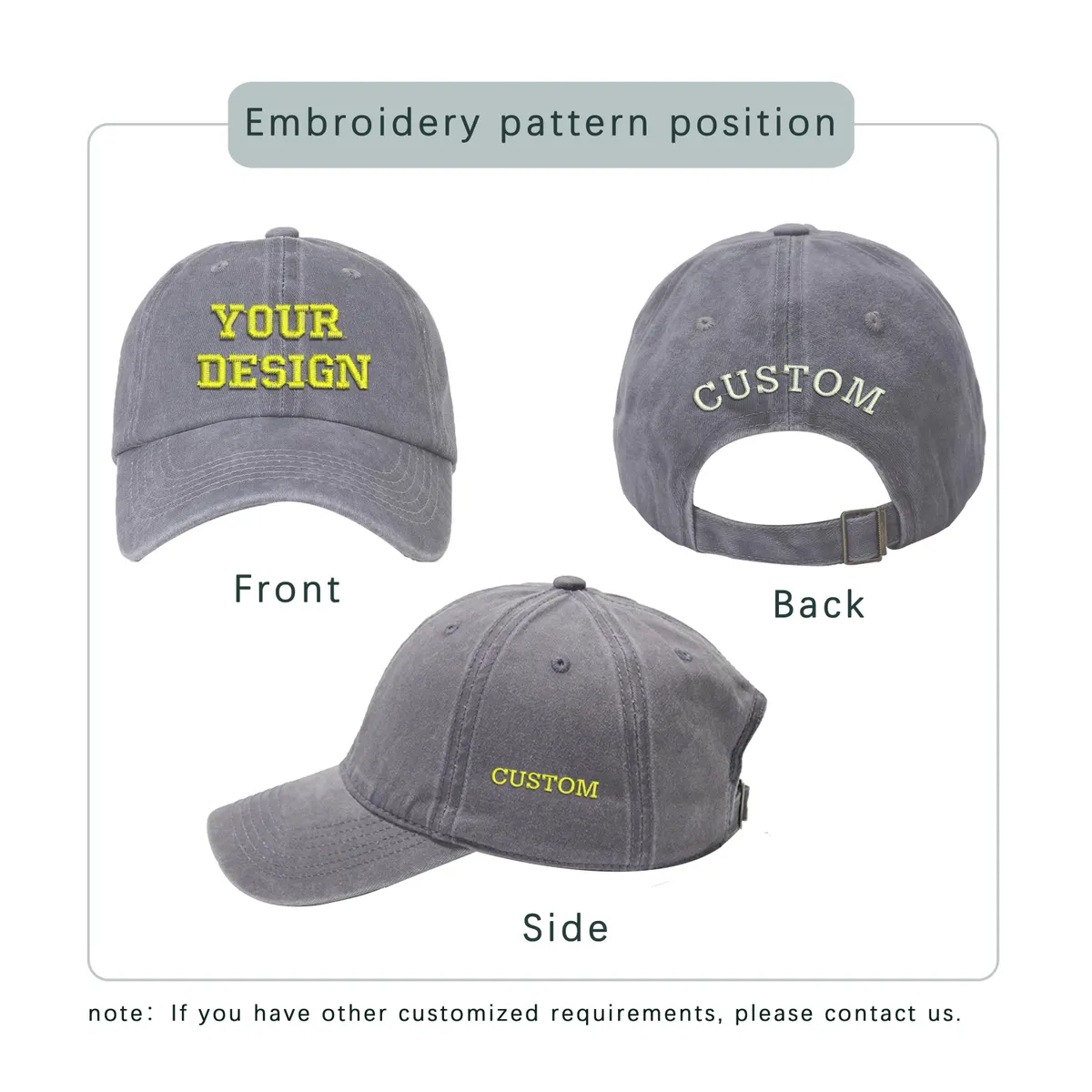 - Adjustable Closure: Each male and female baseball cap includes a pre-curved bill, anti-sweat band, and metal buckle closure, making it a reliable custom embroidered hat for any head shape.