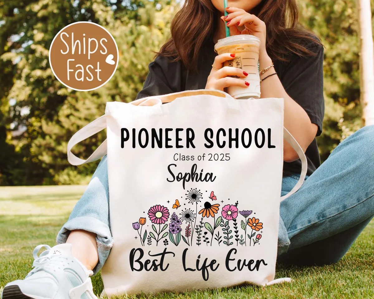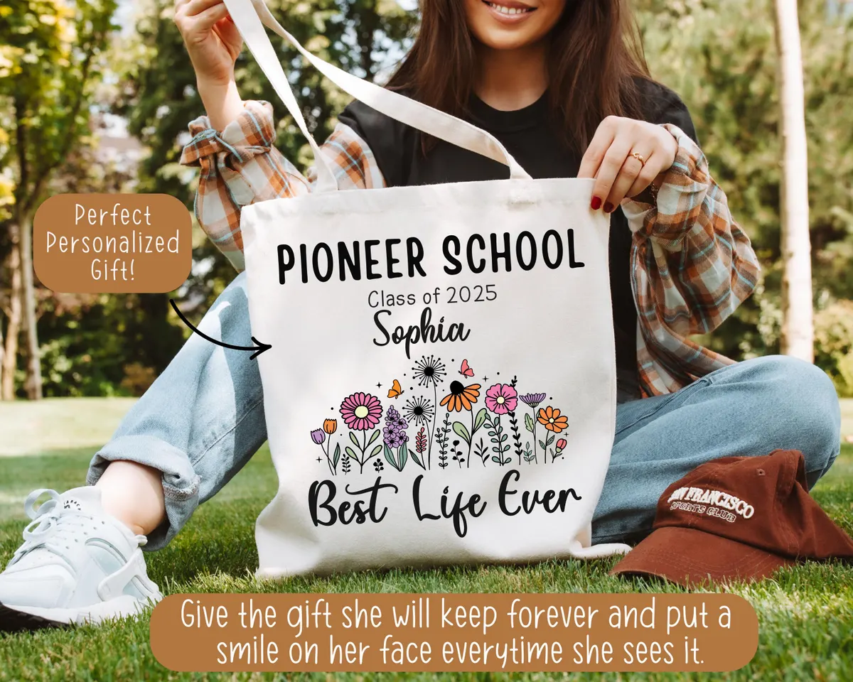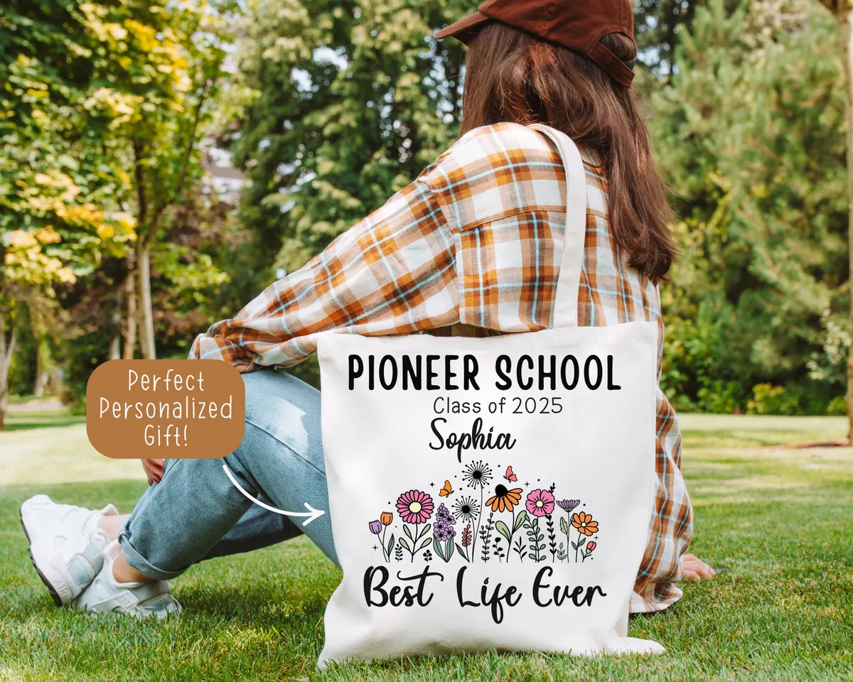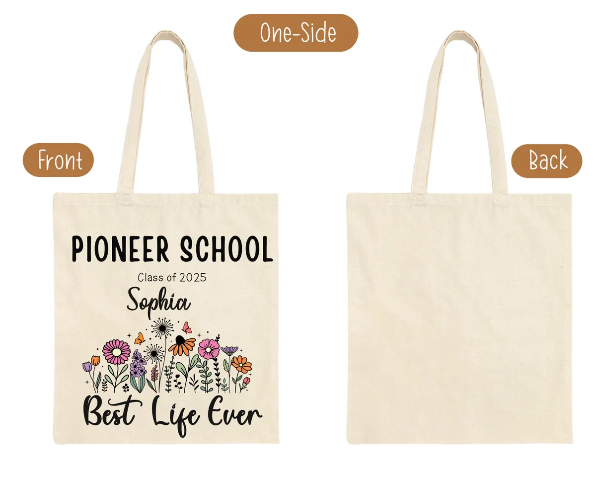 Celebrate a meaningful milestone with this personalized Pioneer School tote bag, designed with a delicate floral book illustration and the phrase “Best Life Ever.” Crafted from durable cotton canvas, this tote is ideal for everyday use or as a cherished keepsake.