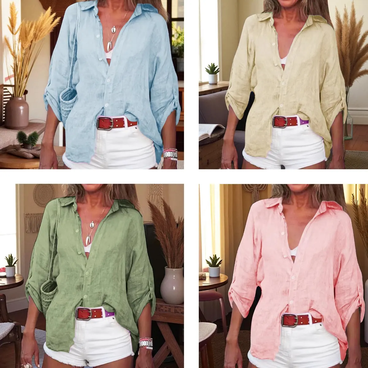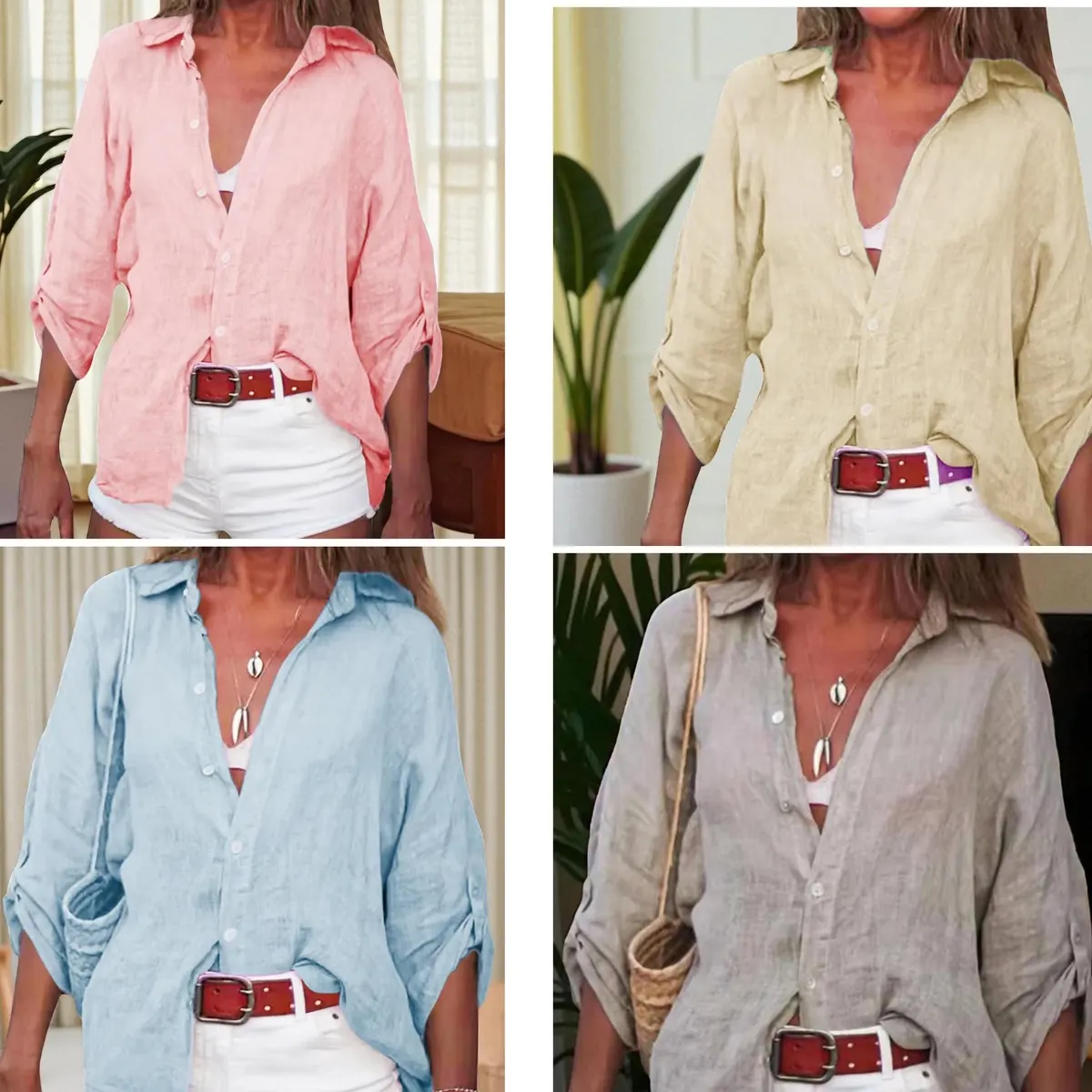 - Feature: 3/4 sleeves are another major feature of button up blouse. Fold the sleeves up to turn it into a short-sleeved shirt, a piece of clothing with two uses, allowing you to experience different ways of wearing it. Classic V-neck elegantly highlights the collarbone; the slim waistline creates a sophisticated and capable workplace aura and highlights the self. The curved hem is a unique design that breaks the rigidity and monotony of women’s shirts and highlights a touch of leisure.